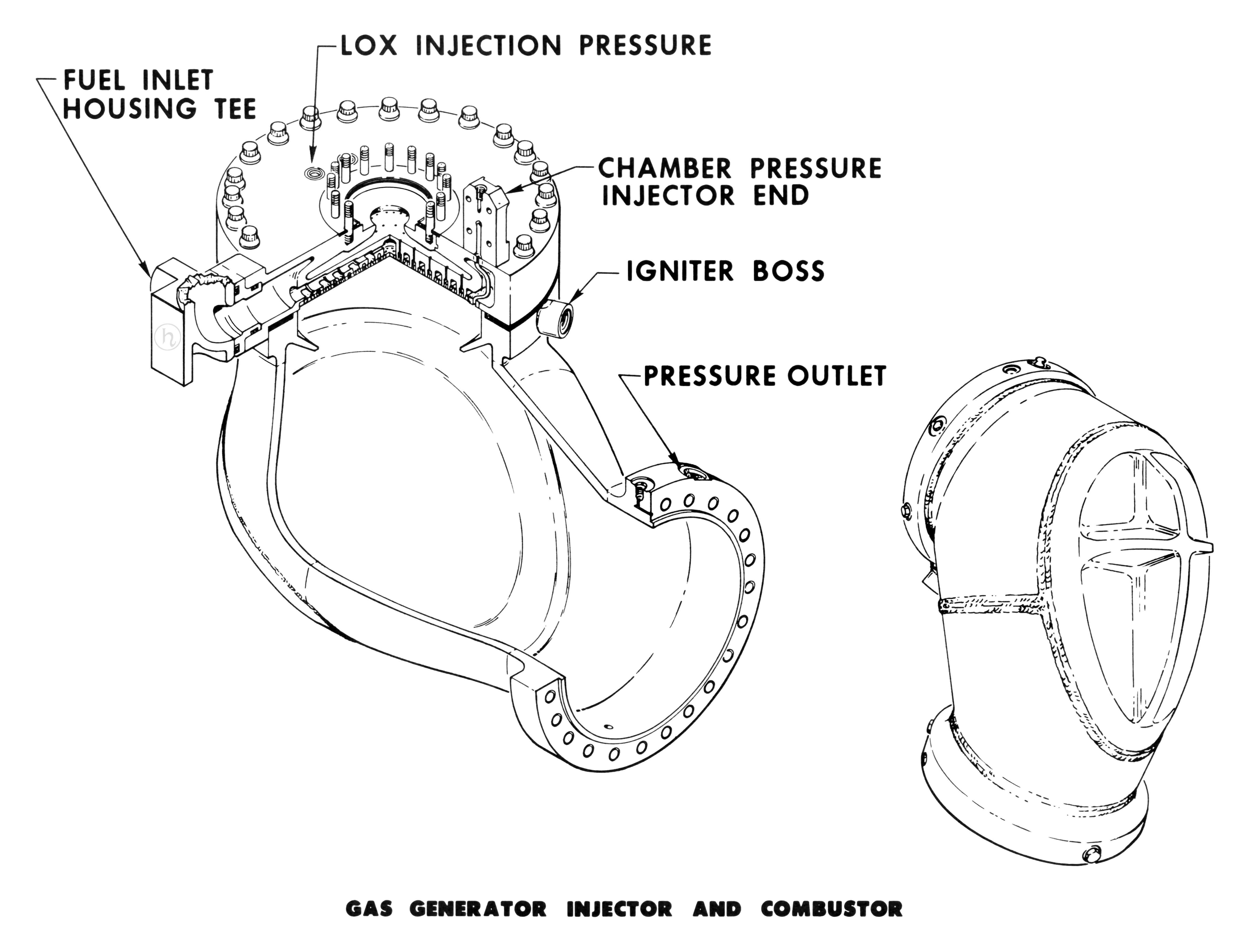 The combustor was a welded, single-walled chamber connecting the gas generator injector and the turbine inlet. The combustor was was thermally insulated by a sheet metal shell that bolted around the combustor body. The inlet flange is the attach point for the injector and dome assembly and incorporates a 45-degree lip section that deflected the flame pattern to the bottom section of the combustor. Also incorporated in the inlet flange were two bosses (45 degrees apart) for pyrotechnic igniters and two ports (150 degrees apart) to monitor gas pressure at this point.