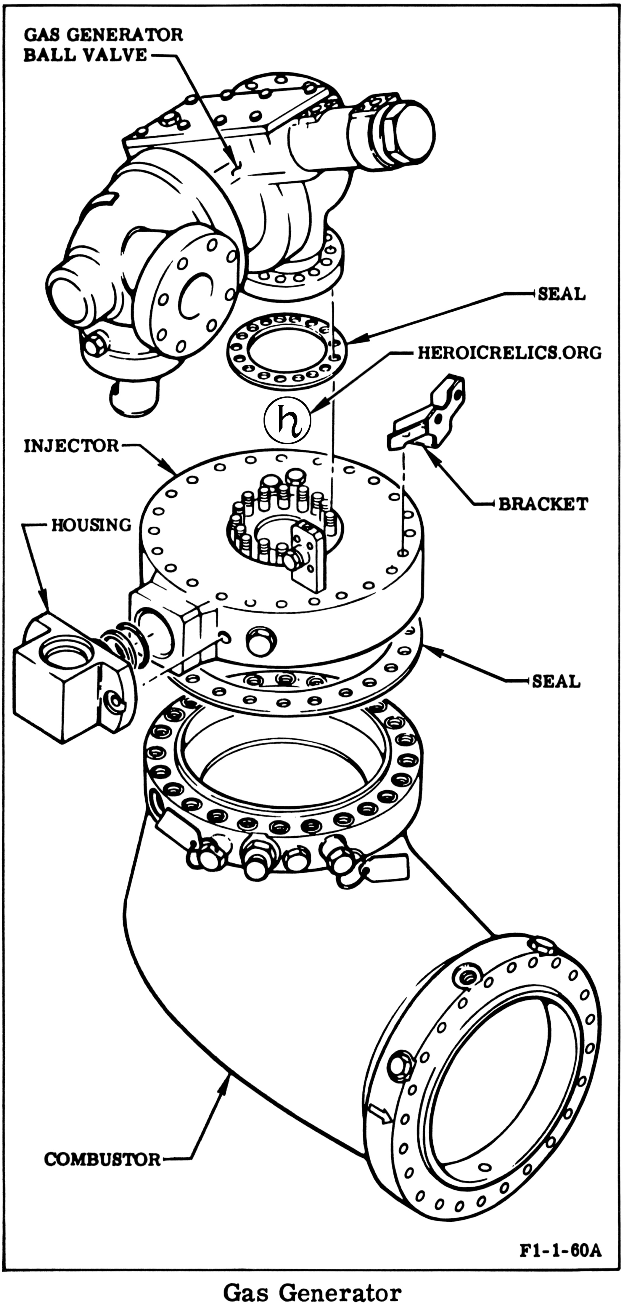 Exploded-view diagram of an F-1 rocket engine gas generator, including its