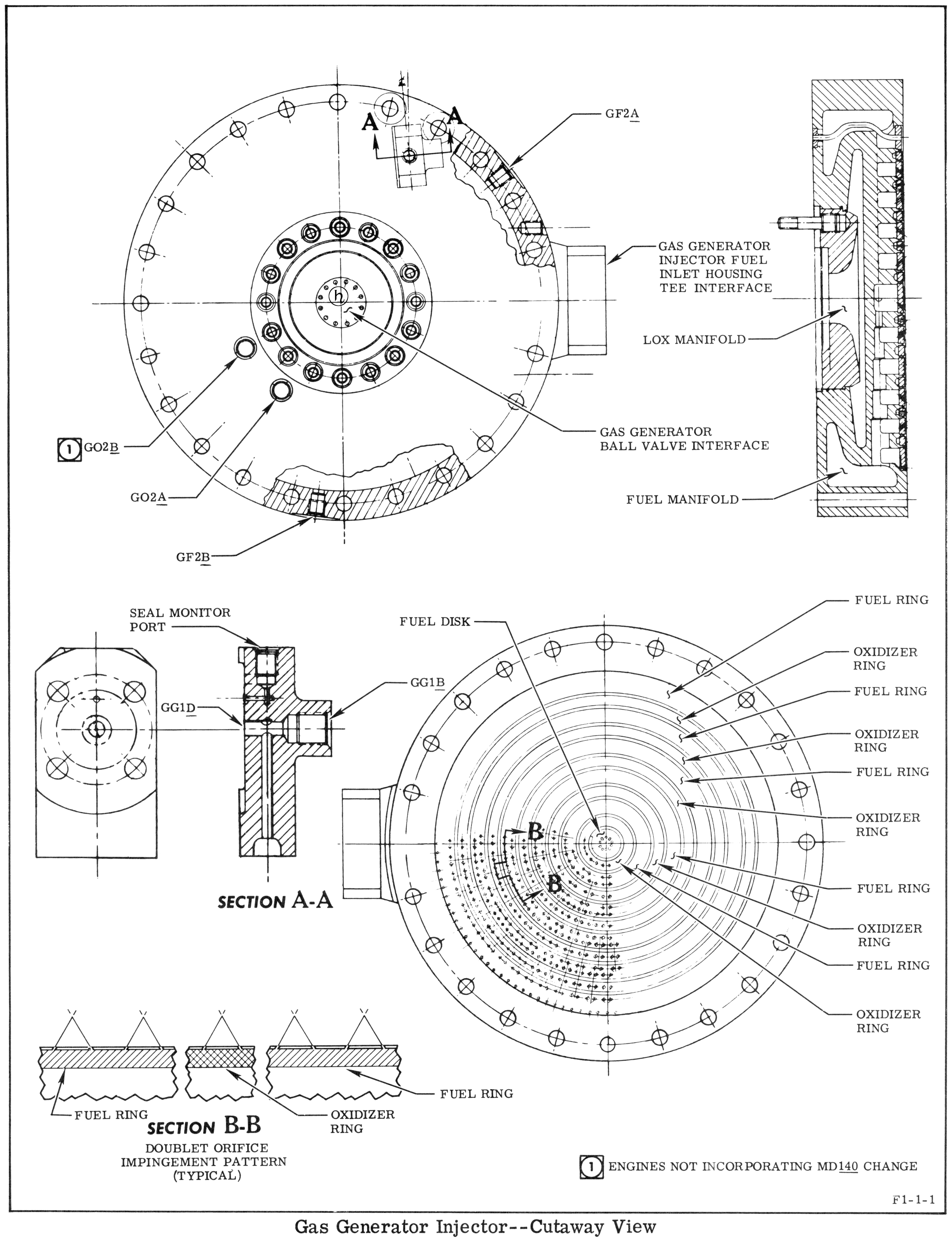 The gas generator injector was a flat-faced, multi-orificed-type injector incorporating a dome, a plate, a ring manifold, five oxidizer rings, five fuel rings, and a fuel disk. The injector was mounted on the combustor, and the gas generator ball valve and the gas generator fuel inlet housing tee were mounted on the injector. The injector directed fuel and oxidizer into the gas generator combustor. Fuel entered the injector through the gas generator fuel inlet housing tee from the gas generator ball valve. The fuel was directed through radial passages in the plate and injected into the combustor through orifices in the five fuel rings and the fuel disk. Oxidizer entered the injector through the oxidizer inlet manifold from the gas generator ball valve. The oxidizer was directed from the oxidizer manifold through internal passages in the plate and was injected into the combustor through the orifices in the five oxidizer rings. The injector used a double-orificed pattern in which the fuel and oxidizer rings were drilled in a pattern and angled so that the stream from one oxidizer orifice impinged upon the stream from another oxidizer orifice, and the stream from a fuel orifice impinged upon the stream from another fuel orifice. Orifices in the outer fuel ring also provided a cooling film of fuel for the combustor, further holding temperatures to safe operating limits.