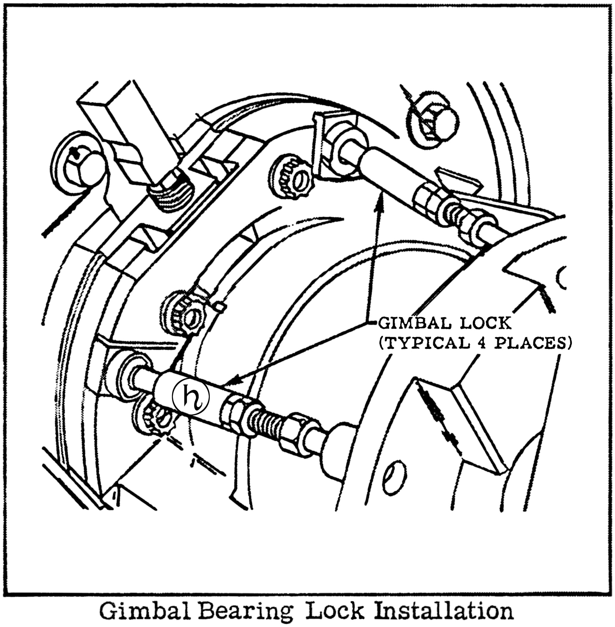 The gimbal bearing lock was a simple screwjack mechanism with socket-type interface mounts. Four gimbal bearing locks were positioned around the gimbal bearing. The length of the locks was adjusted as required to center and immobilize the gimbal.