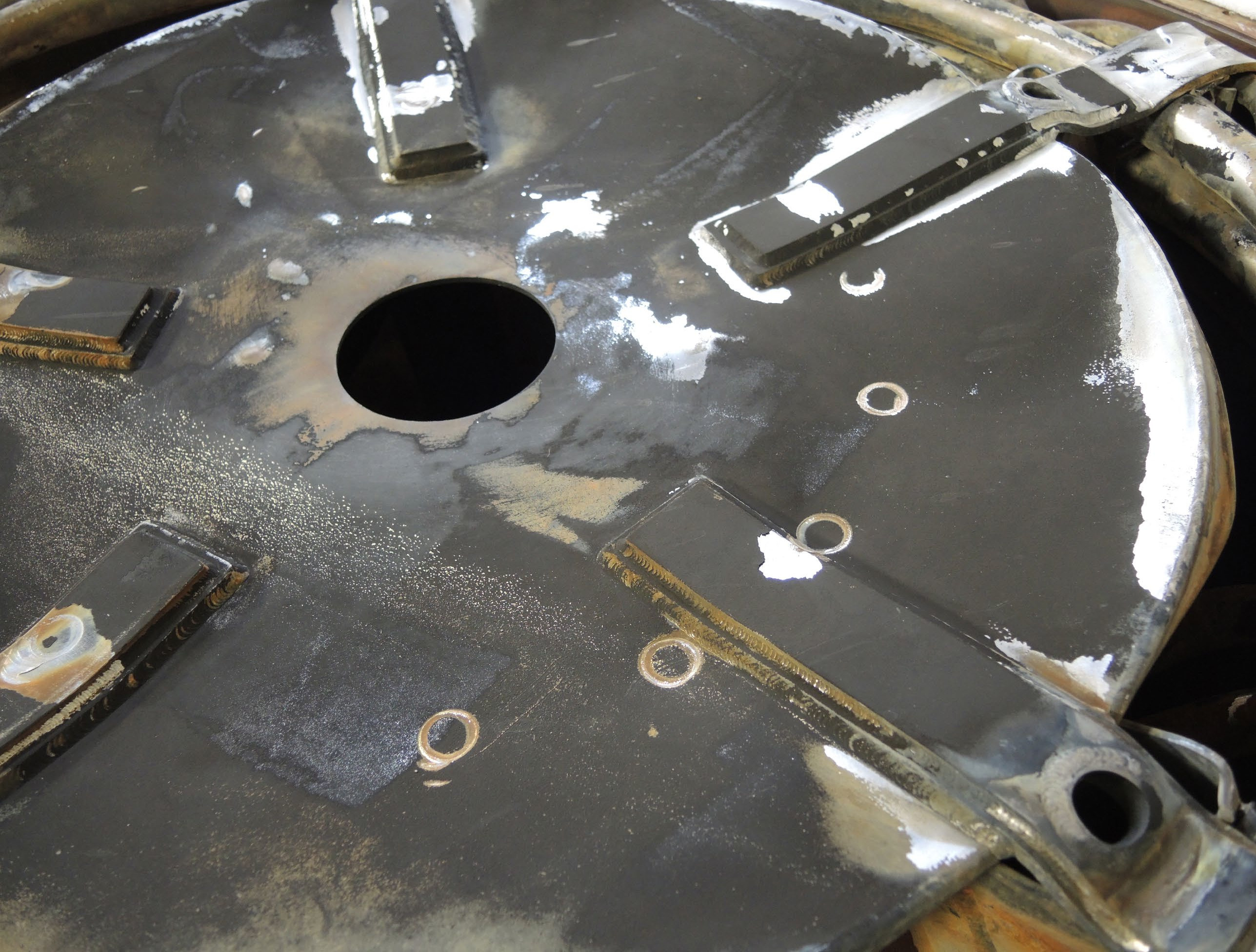 Contained inside and supported by the shell was a four-coil oxidizer pack and a two-coil helium pack. The turbine exhaust gas passed over the coils, although as shown in the diagram above, the heat exchanger inlet had some sort of a plate which blocked the direct flow of most of the turbine exhaust gas; I speculate that this is to help shield the coils from the direct jet blast of the gas (of course, the jet blast would be attenuated somewhat after passing through the two-stage turbine in the turbopump). Here is a photo of this plate on one of the recovered F-1 engine's heat exchanger while it was under conservation at SpaceWorks.