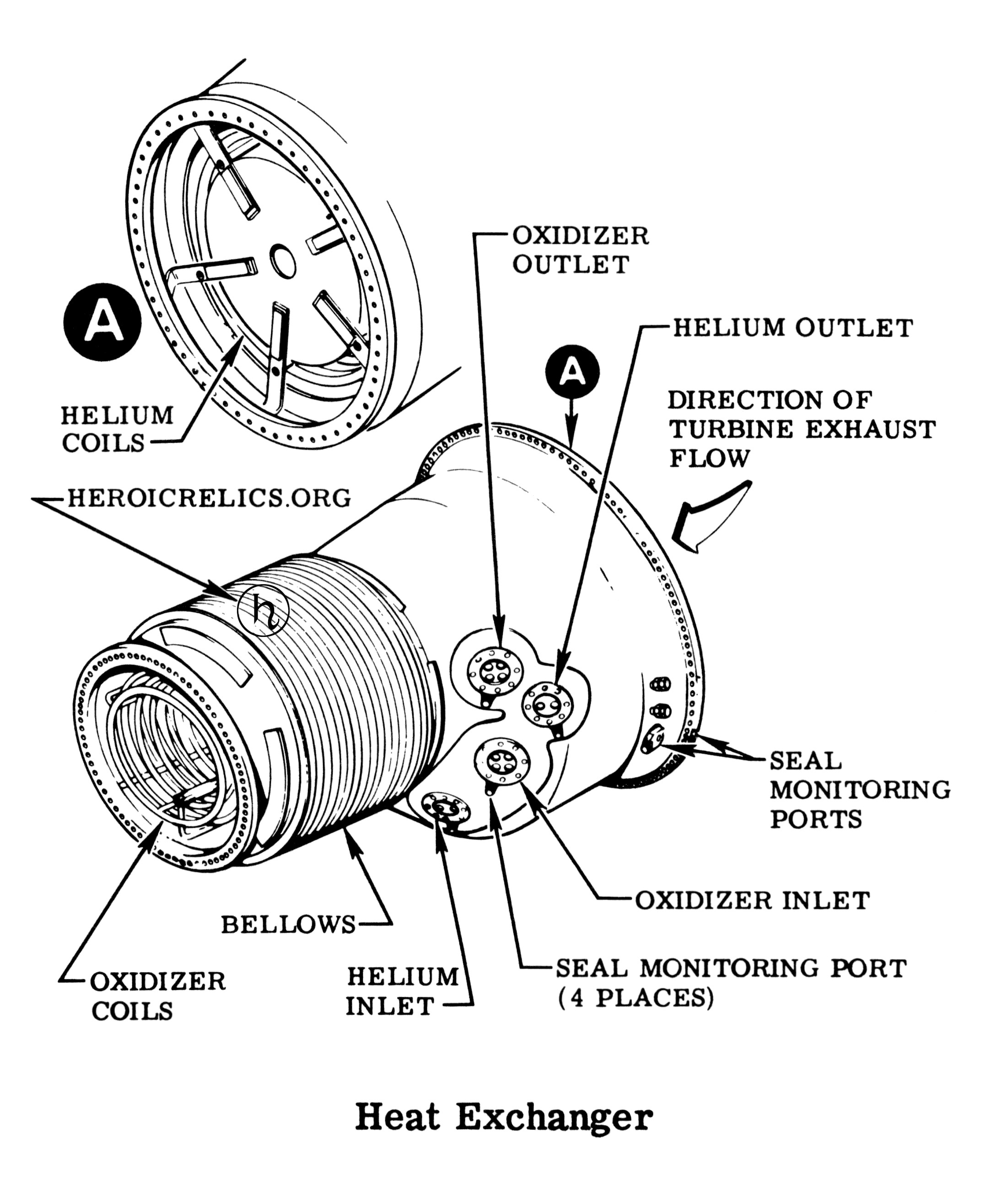 Diagram of an F-1 rocket engine heat exchanger, including its inlet, helium